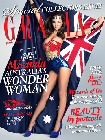 Grazia has won ?Magazine Cover of the Year? with their January 30, 2012 issue featuring a patriotic Miranda Kerr as Australia?s Wonder Woman. The stunning Grazia cover beat over 220 titles across eleven categories to be crowned overall winner of The Maggies: Magazine Cover Awards 2012, as well as winning the Weeklies category.